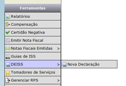 1) Acesse o Menu "DEISS -> Nova Declaração". Certifique-se de que você tem acesso à esta ferramenta.